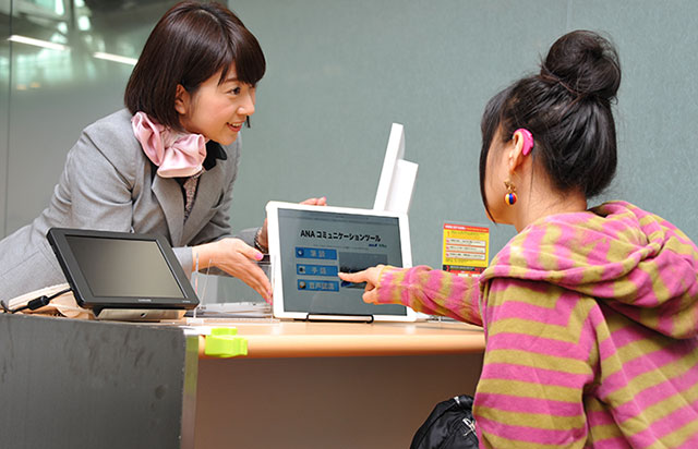ANAはSpecial Assistanceカウンターで、樹脂製車いすの導入を開始。保安検査をそのまま通過できるようにした。空港内では手荷物預かり所や自動チェックイン機などの案内表示に大きめのピクトグラム(絵文字)を導入し、公平なサービスを目指す「ユニバーサルサービス」を提供する。