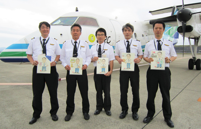 6月に創業55周年を迎える長崎県のオリエンタルエアブリッジ(ORC、NGK)では、利用者に身近に感じてもらえるよう、乗務する機長を似顔絵で紹介している。