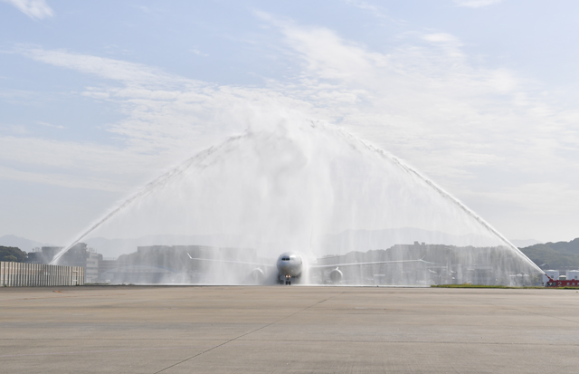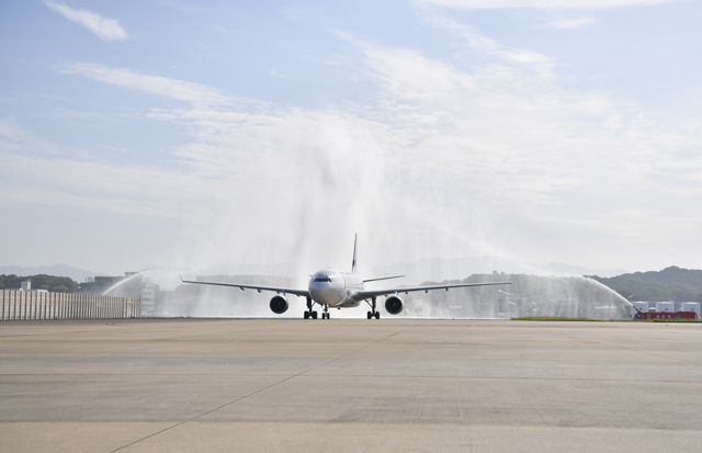 ヘルシンキ発初便のAY75便は、乗客256人と乗員13人の269人を乗せ、福岡に午前7時55分に到着。消防車の放水アーチで歓迎を受け、パイロットが日本とフィンランド両国の国旗を掲げながら駐機場へ入った。駐機場では、人気キャラクター「ムーミン」も出迎えた。
