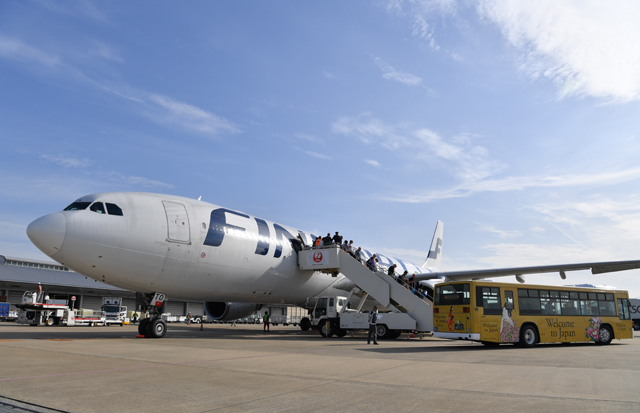 福岡空港に到着し飛行機を降りるフィンエアーの福岡行き初便AY75便の乗客=16年5月8日 PHOTO: Tadayuki YOSHIKAWA/Aviation Wire