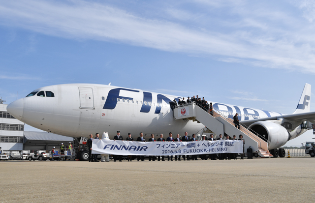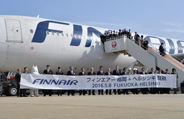フィンエアー(FIN/AY)のヘルシンキ-福岡線初便が5月8日、福岡空港に到着した。10月までの夏ダイヤ期間中、週3往復の夏期定期便として運航する。フィンエアーが九州へ乗り入れるのは初めて。