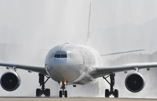 福岡空港で放水アーチの歓迎を受けるフィンエアーの福岡行き初便AY75便=16年5月8日 PHOTO: Tadayuki YOSHIKAWA/Aviation Wire