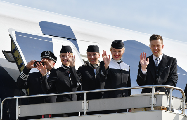 福岡空港に到着したフィンエアーの初便AY75便の客室乗務員=16年5月8日 PHOTO: Tadayuki YOSHIKAWA/Aviation Wire