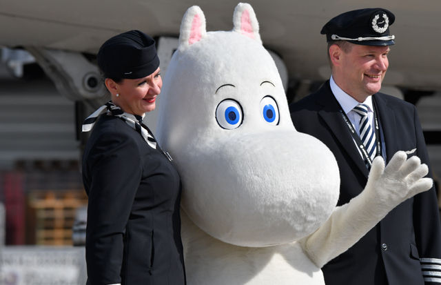 ムーミンと記念撮影するフィンエアーのパイロットと客室乗務員=16年5月8日 PHOTO: Tadayuki YOSHIKAWA/Aviation Wire