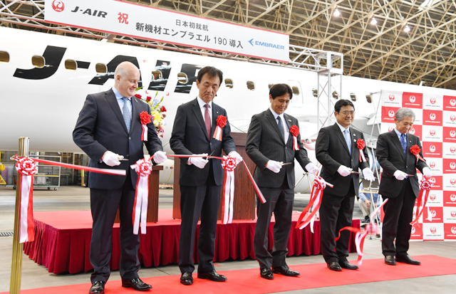 E190導入記念式典でテープカットするジェイエアの大貫社長(左から2人目)ら=16年5月9日 PHOTO: Tadayuki YOSHIKAWA/Aviation Wire