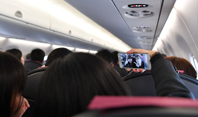 E190の機内で記念撮影する高校生=16年5月9日 PHOTO: Tadayuki YOSHIKAWA/Aviation Wire