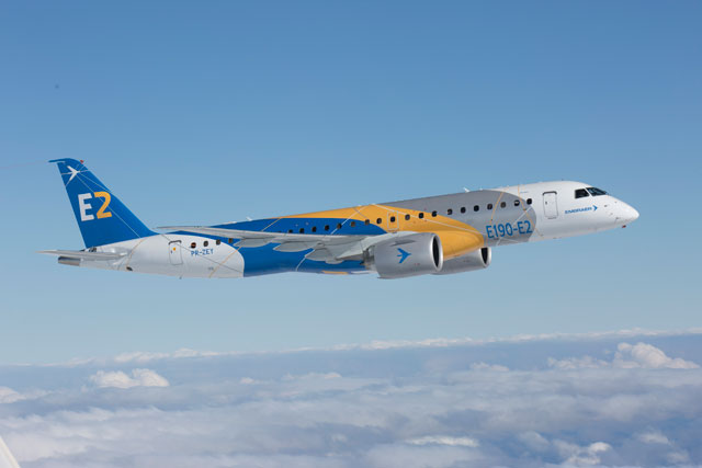 計画より前倒しで初飛行に成功したエンブラエルE190-E2の飛行試験初号機(同社提供)