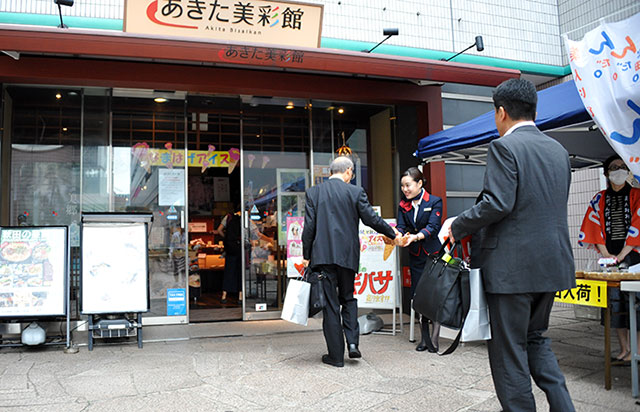 同店の店員や同県出身のCA、森田舞さん(26)らは、山菜類など秋田のおいしいものや、8月3日から6日まで、秋田市内で開催される「秋田竿灯まつり」などを宣伝。昼休み中のビジネスマンや観光客にパンフレットやキャンディを配った。