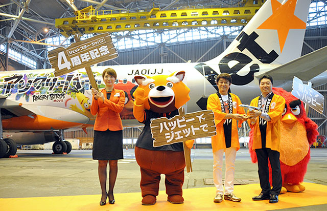 ジェットスター・ジャパン(JJP/GK)は7月1日から、同社初となるデカール機の運航を開始する。映画『アングリーバード』のキャラクターをデザインした機体「ハッピージェット」で、10月末までの運航を予定している。運航開始前日となった6月30日、成田空港内で機体のお披露目会を実施。同映画で声優を務めたタレントの坂上忍さんを招き、同社と映画をピーアールした。