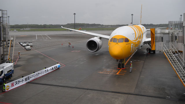 機材はボーイング787-8型機(335席:スクートビズ21席、エコノミー314席)。初便のバンコク発TZ292便(787-8、9V-OFC)は成田へ午前9時13分に到着し、折り返しのTZ291便は午前10時25分にバンコクへ向けて出発した。乗客数と搭乗率は成田着のTZ292便が304人で90.7%、成田発のTZ291便が321人で95.8%だった。