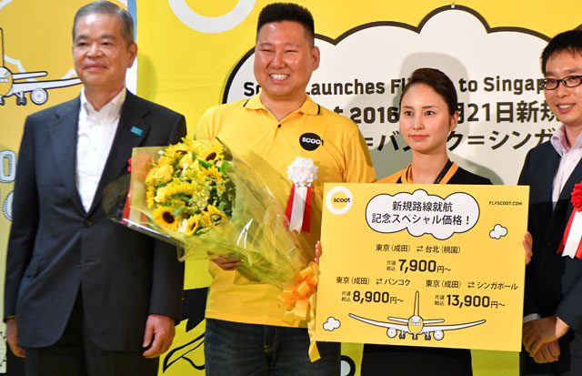 バンコク経由便の就航記念運賃を示すスクートの坪川支社長(左から2人目)と客室乗務員=16年7月21日 PHOTO: Tadayuki YOSHIKAWA/Aviation Wire