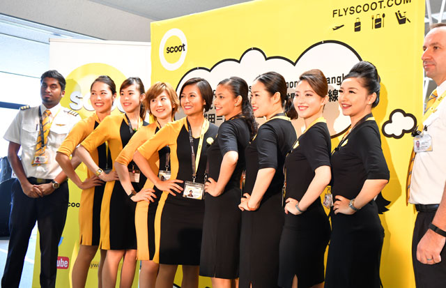 成田空港で記念撮影するスクートのパイロットと客室乗務員=16年7月21日 PHOTO: Tadayuki YOSHIKAWA/Aviation Wire