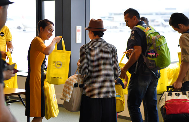 バンコク経由初便の乗客に記念品を配るスクートの客室乗務員=16年7月21日 PHOTO: Tadayuki YOSHIKAWA/Aviation Wire