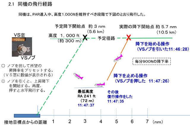 報告書によると、2014年4月28日午前11時47分ごろ、石垣空港を午前10時52分に出発したMM252便の高度が、那覇空港の北約7キロ沖で102メートルまで下がり警報装置が作動。操縦していた機長(当時45)が、高度72メートルのところで機首上げをし、ゴーアラウンド(着陸復行)を実施した。管制官とのやり取りは副操縦士(同38)が担当していた。