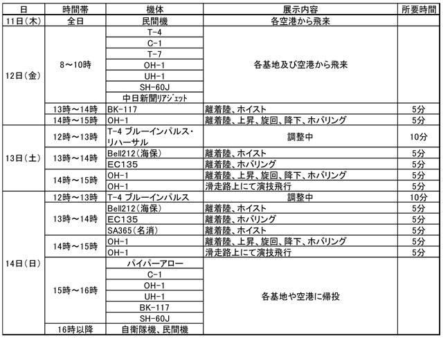 12日からの飛行展示の予定は、民間機は前日11日に各空港から、自衛隊機は12日午前8時から10時までに各基地から飛来する。展示機は12日から14日までの展示後、順次各空港や基地へ帰投する。航空自衛隊のブルーインパルスによる展示飛行は、13日正午すぎにリハーサルが、14日正午すぎに本番が行われる予定。