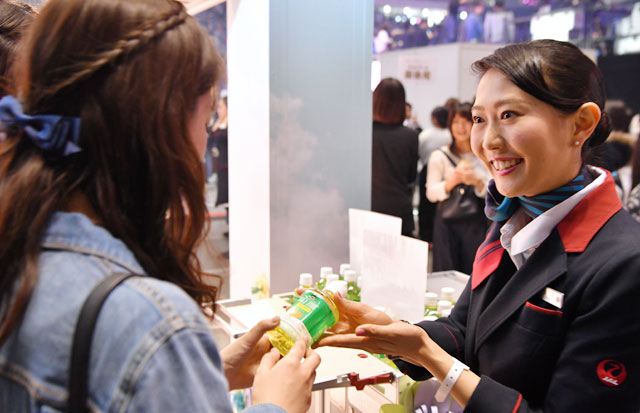 ブースでは、3人の客室乗務員が出迎え、体験用制服の着付けをしたり、記念撮影を終えた来場者に機内で提供しているドリンク「スカイタイム」を手渡していた。ブースで撮影した写真をInstagramやTwitterに投稿すると、抽選で2人1組にユニバーサル・スタジオ・ジャパンの入場券と国内線往復航空券などをプレゼントし、参加者によるSNSでの拡散を見込んでいる。