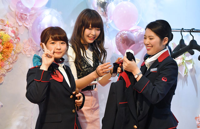 東京ガールズコレクションのJALブースで制服の着用体験を終えた来場者=17年3月25日 PHOTO: Tadayuki YOSHIKAWA/Aviation Wire