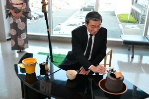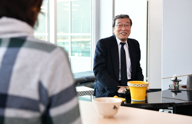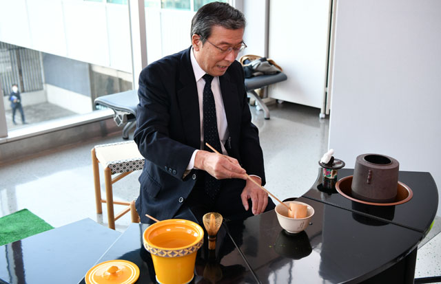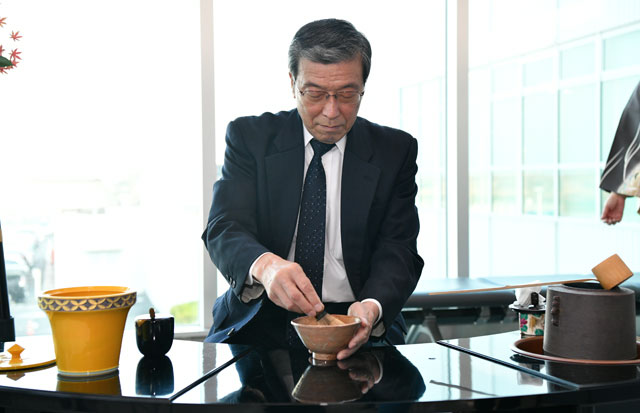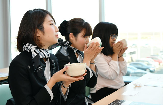 お茶の監修は、表千家教授の須田美代子さんが担当。須田さんは2006年に北九州空港が開港した際、来港者にお茶をふるまった。昨年に続いて松石社長のお茶のたて方を見た須田さんは「筋がいいですね。今回も『忘れた』とおっしゃっていたのですが、すぐに会得されていました」と太鼓判を押す。