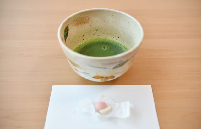 茶器は須田さんが用意し、黄色い水差しを交えるなど、場が明るくなるようにしたという。抹茶は福岡・八女のものを使用した。須田さんによると、茶菓子を食べた後にお茶を飲むことで、味が引き立つという。記者(私)も指導に従ってお茶を味わったが、お茶だけ口にするよりも、茶菓子を食べてからのほうが苦みの印象が薄まり、深みが感じられた。