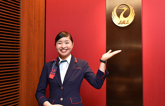 鹿児島空港サクララウンジのエントランスに立つJALの地上係員=18年2月27日 PHOTO: Yusuke KOHASE/Aviation Wire
