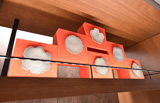 ドリンクサーバー上部の棚に設える(右から)奄美泥染の生地、龍郷スミ千代柄の生地、沈壽官窯の焼物=18年2月27日 PHOTO: Yusuke KOHASE/Aviation Wire