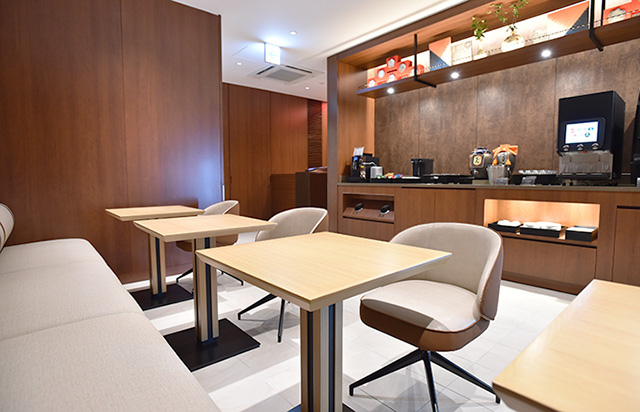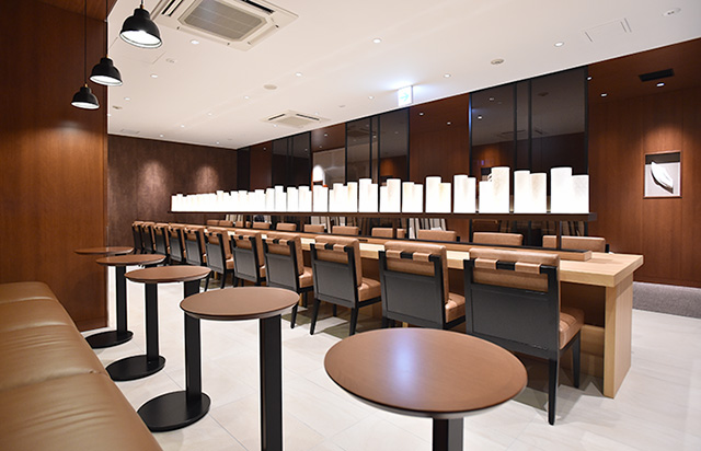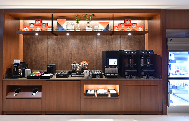 リニューアルにより、鹿児島の素材や伝統工芸を用いた空間を提供する。入り口には鹿児島・霧島市出身の現代美術家、戸高千世子さんの作品を設置。ドリンクサーバー上部の棚には、薩摩錫器(すずき)、奄美泥染の生地、奄美・龍郷(たつごう)スミ千代柄の生地、沈壽官窯(ちんじゅかんがま)の焼物を飾る。また座席上部には、桜島の火山灰を練り込んだランプシェード12台も設けた。