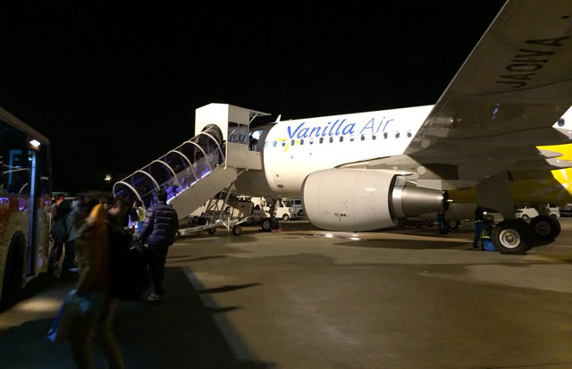 約3時間のフライトは楽しく、あっという間だった。成田には定刻より7分早い午後9時53分、オープンスポットに到着した。LCCらしくタラップから降りて、バスでターミナルへ向かった。ターミナルでは、VNLの石井知祥社長が初便の乗客を出迎えた。