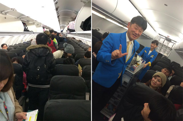 混雑する機内(左)と機内販売する五島副社長=12月20日 PHOTO: Katsuaki TSUJI/Aviation Wire