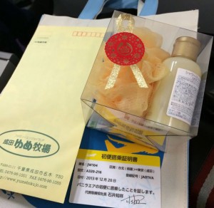 搭乗時には、記念としてVNL特製トートバッグ、初便搭乗証明書、機内でも販売されている「THE BODY SHOP」のシャワージェルとボディクリーナーのセット(このセットは通常は機内販売されていない)、成田ゆめ牧場のペア無料入場券などが乗客一人ひとりに五島副社長から手渡された。