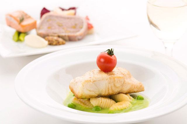 ビジネスで提供する「チリアンシーバスのソテーとリコッタチーズのニョッキ グリーンピースソース」(JAL提供)