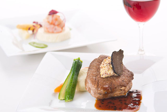 ファーストで提供する「USプライムビーフフィレ肉のステーキ黒トリュフのソース」(JAL提供)