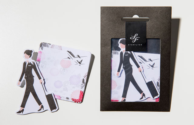 スターフライヤーの制服は、国内では珍しいパンツスタイルを採用。客室乗務員の絵柄は制服姿がはえるよう全身をデザインし、付せんに描く花はコーポレートフラワーの「ダリア」を選んだ。