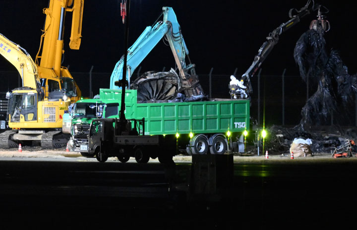 JAL A350-900 JA13XJの撤去作業が進む羽田C滑走路=24年1月6日20時10分 PHOTO: Tadayuki YOSHIKAWA/Aviation Wire