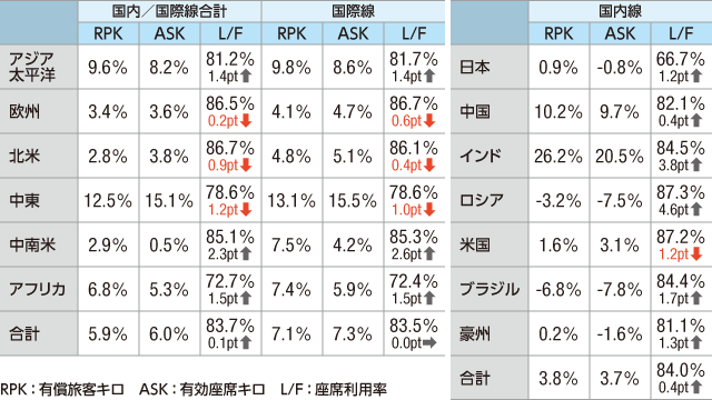 IATA(国際航空運送協会)の2016年7月世界旅客輸送実績は、国際線と国内線の合計で、有償旅客の輸送距離を示すRPK(有償旅客キロ)は対前年同月比5.9%増加、座席供給量を示すASK(有効座席キロ)は6.0%増加した。ロードファクター(座席利用率、L/F)は0.1ポイント上昇し83.7%だった。