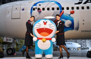 ドラえもんJETをお披露目するドラえもんとJALの客室乗務員=16年9月21日 PHOTO: Tadayuki YOSHIKAWA/Aviation Wire