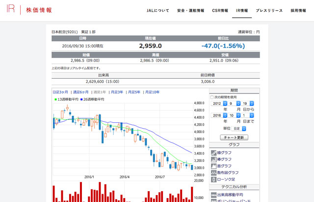 リニューアルオープンしたJALの企業ホームページの株価情報