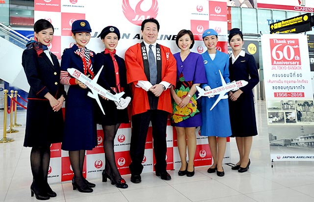 日本航空(JAL/JL、9201)は10月4日、バンコク線就航60周年を迎えた。タイのスワンナプーム空港にあるJALの出発カウンターでは、植木義晴社長が記念品を配り、利用客に謝意を示した。また、客室乗務員が歴代制服を着用して利用客を出迎えた。