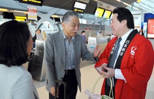 利用客と談笑する植木社長(右)=16年10月4日 PHOTO: Yusuke KOHASE/Aviation Wire