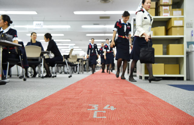 羽田のブリーフィングルームにある“滑走路”から出発するJALの客室乗務員=16年10月14日 PHOTO: Tadayuki YOSHIKAWA/Aviation Wire