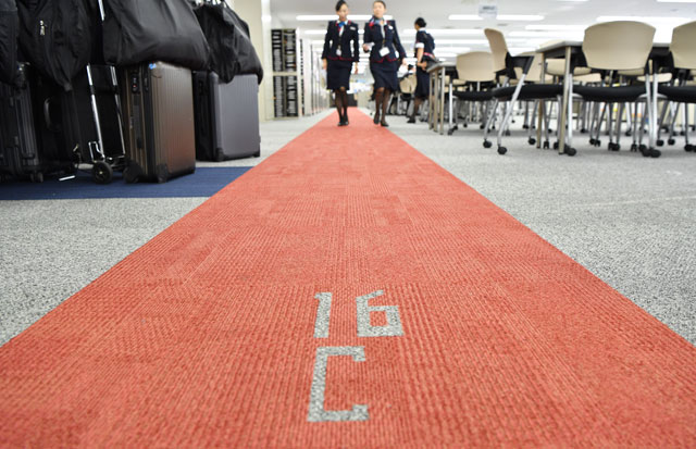 今春張り替えた際、この通路部分をコーポレートカラーに合わせて赤に変えた。多くの客室乗務員は、ブリーフィングを終えると部屋の南側にある出入口からフライトに向かい、羽田に着くと同じ出入口から帰ってくる。