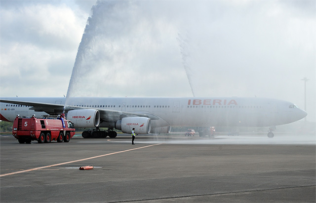 放水アーチの歓迎を受けるIB6801便=16年10月19日 PHOTO: Yusuke KOHASE/Aviation Wire