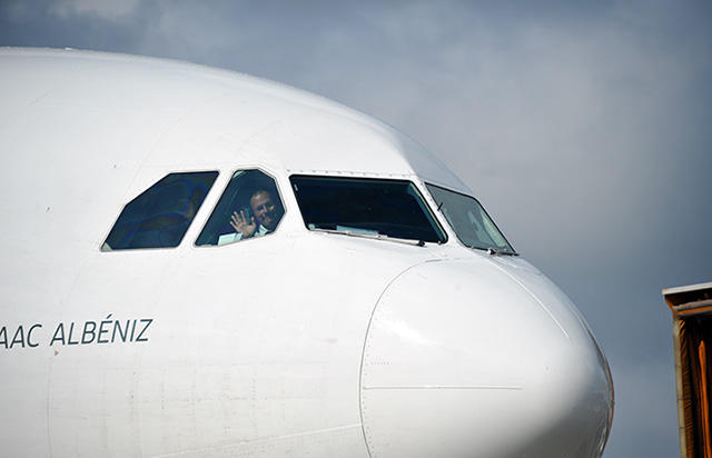 コックピットから手を振るイベリア航空の運航乗務員=16年10月19日 PHOTO: Yusuke KOHASE/Aviation Wire