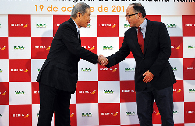 NAAの夏目社長と握手を交わすイベリア航空のガジェゴ会長=16年10月19日 PHOTO: Yusuke KOHASE/Aviation Wire