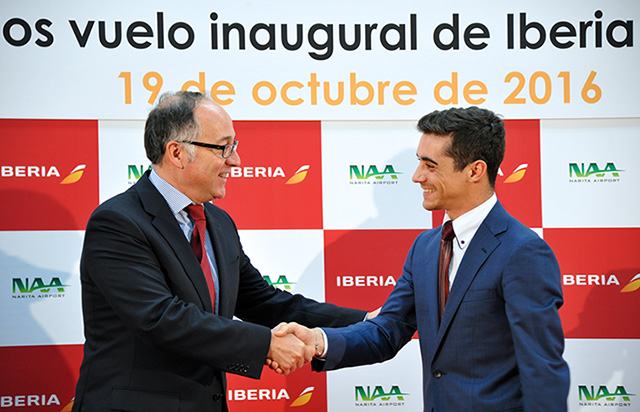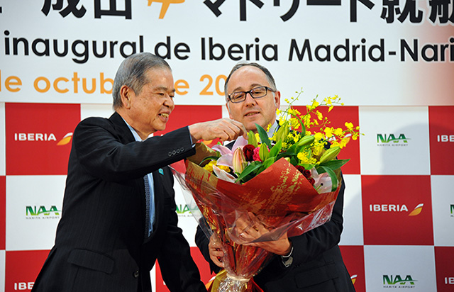 日本からの出発初便を記念し、92番搭乗口では就航式典が開かれた。式典では成田国際空港会社(NAA)の夏目誠社長がイベリア航空のルイス・ガジェゴ会長兼CEO(最高経営責任者)に、花束をプレゼント。スペイン国花のカーネーションと、日本で馴染み深いランやユリを和紙で包んだものを手渡した。また、初便で来日した男子フィギュアスケートのハビエル・フェルナンデス選手も式典に参加した。