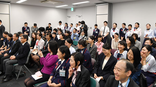 一方、親子の後ろに並び、手続きを急ぐ女性客役の社員、国際旅客グループの大友一絵さんは、イライラしている様子を無言で演じて出場者に緊張感を与え、表彰式では社員役の演技で1位を獲得していた。
