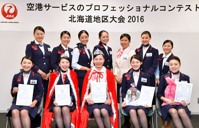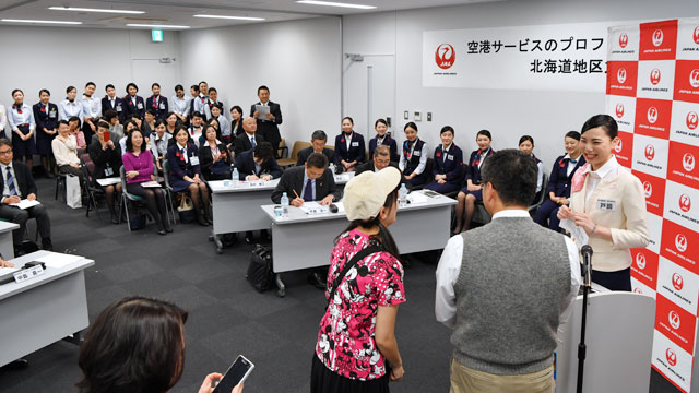 JALグループ北海道地区の地上係員は320人で、このうち新千歳空港では236人が働く。北海道地区大会に参加した5空港は、函館が24人、旭川が18人、女満別が15人、釧路が14人、帯広が13人となっている。新千歳のチェックインカウンターや搭乗口での業務は、JALの子会社JALスカイ札幌が担当している。