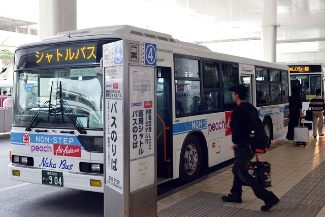 モノレールの那覇空港駅から国内線ターミナルまでの通路に掲げられたバス乗り場を案内するバナー=10月18日 PHOTO: Tadayuki YOSHIKAWA/Aviation Wire