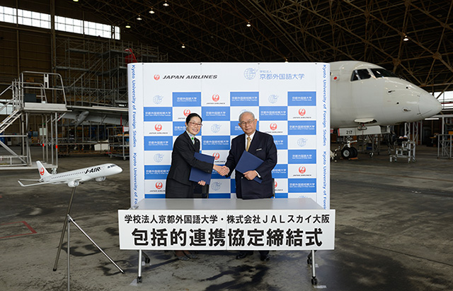 伊丹空港の格納庫で開催した締結式には、JALスカイ大阪の益田和恵社長や京都外大の森田嘉一理事長・総長のほからが出席。その後、学生らが格納庫を見学した。