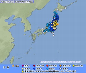 11月22日午前5時59分ごろ、福島県沖60キロ付近を震源とする地震が発生した。気象庁によると地震の深さは10キロ、マグニチュード7.3と推定され、福島・いわき市や白河市などで震度5弱を観測した。