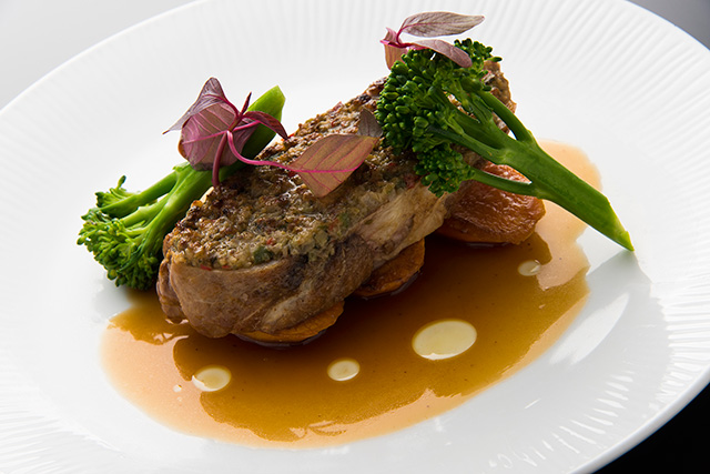 欧米行きファーストで提供する群馬県産氷室豚のスペアリブ(ANA提供)